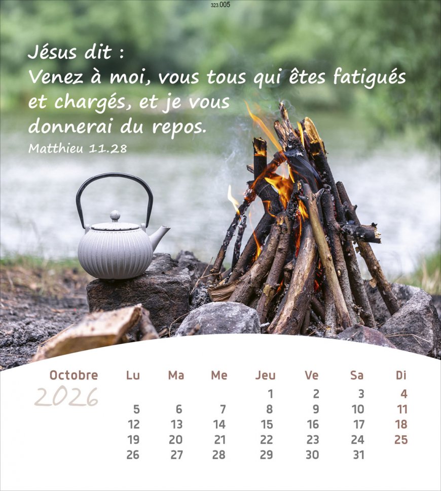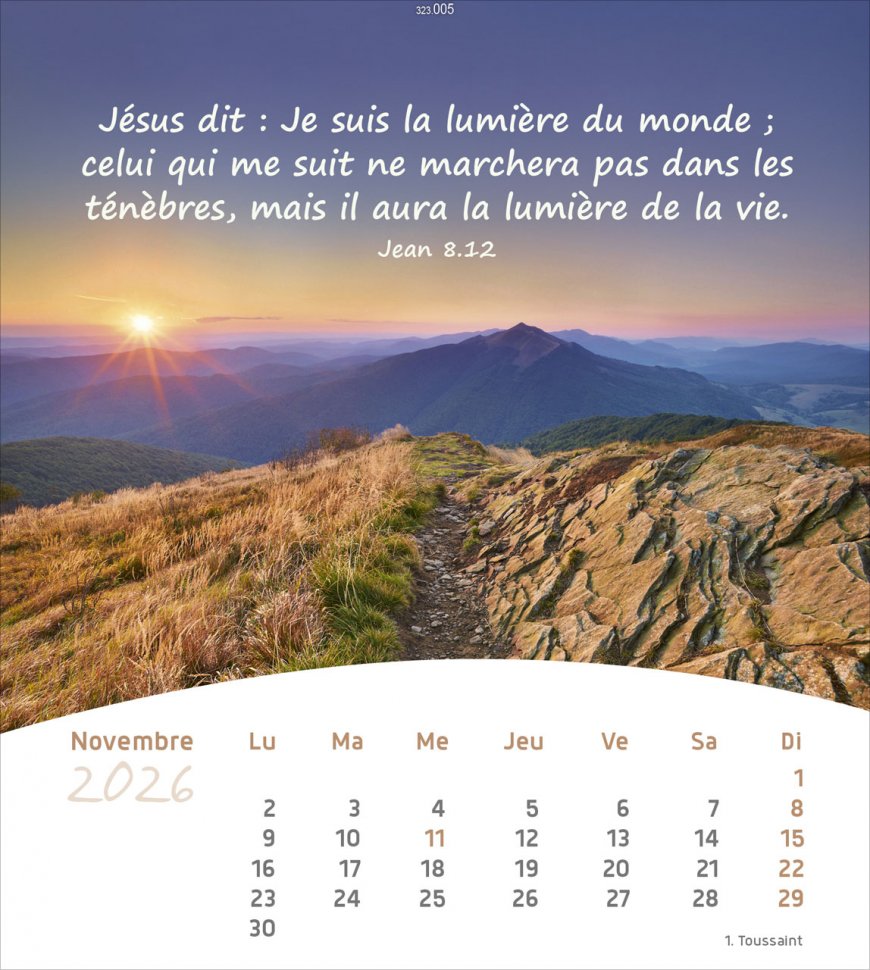 Calendrier missionnaire « La Vie » avec des textes d’évangélisation et 12 cartes postales avec versets bibliques.