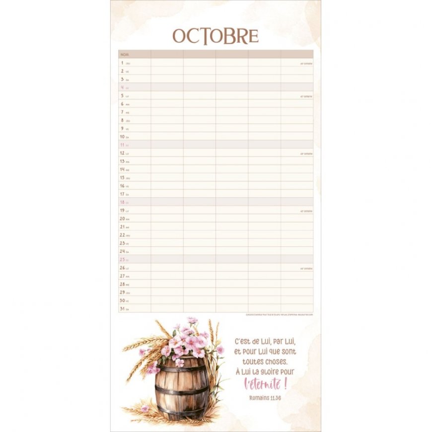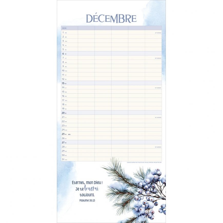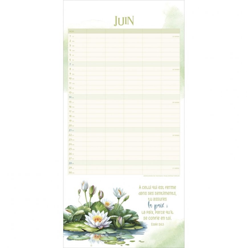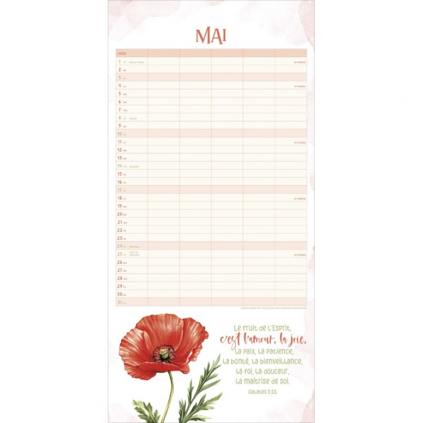 Calendrier mural de planification familiale, 5 colonnes, 12 aquarelles et versets bibliques
