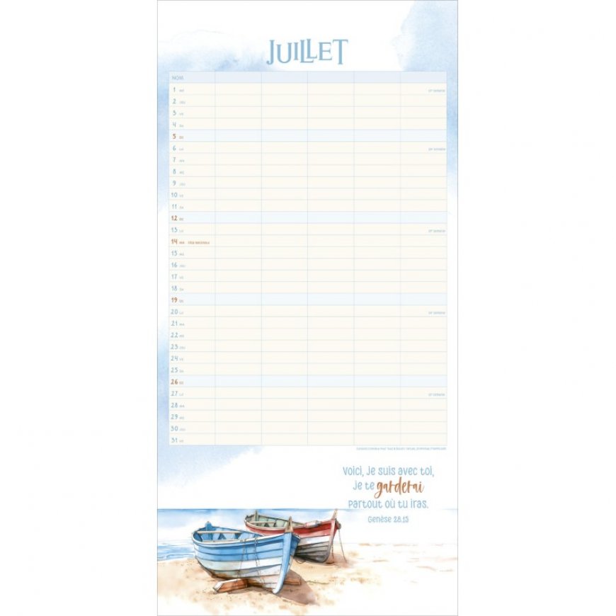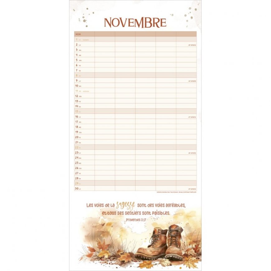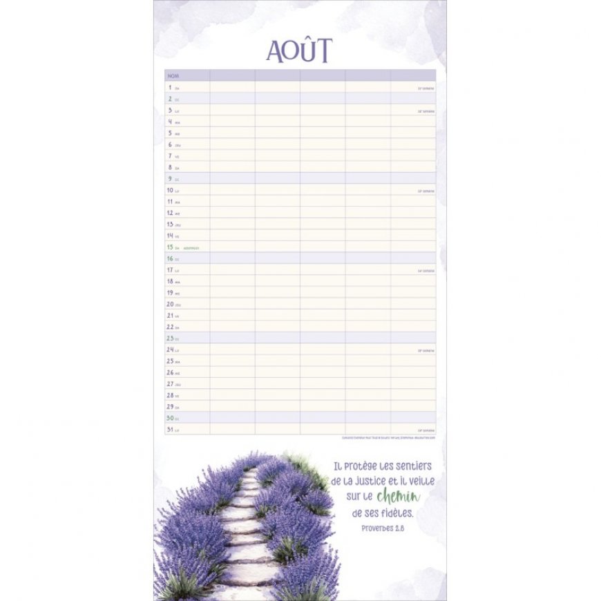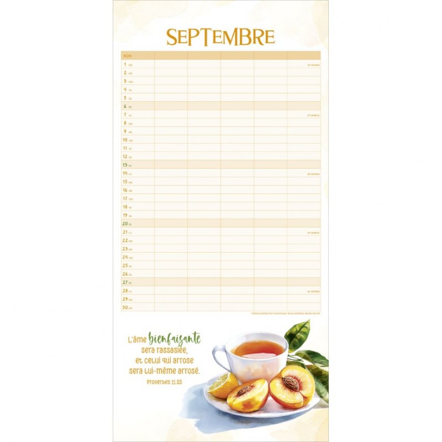 Calendrier mural de planification familiale, 5 colonnes, 12 aquarelles et versets bibliques