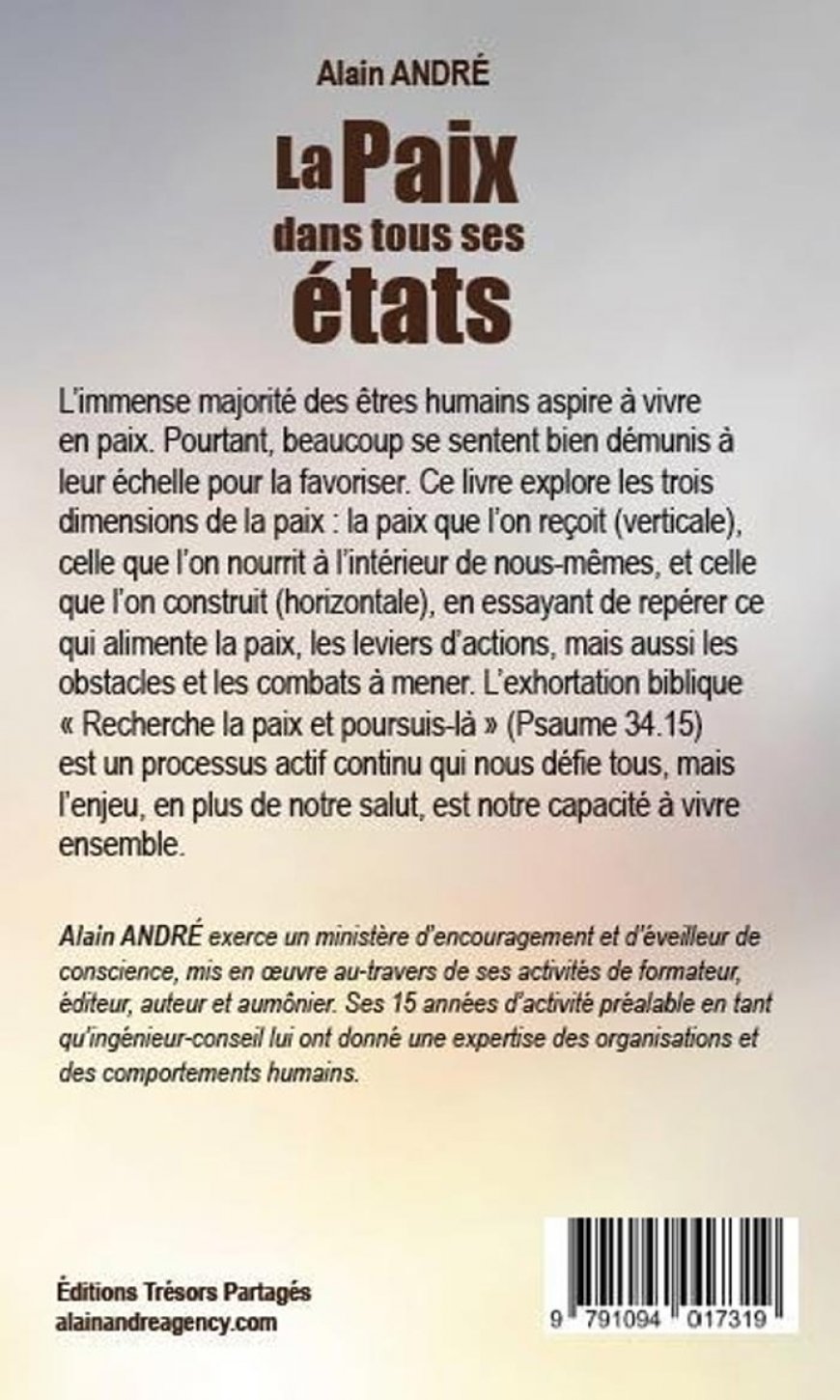 L'immense majorité des êtres humains aspire à vivre en paix. Pourtant, beaucoup se sentent bien démunis à leur échelle pour la favoriser. Ce livre explore les trois dimensions de la paix : la paix que l'on reçoit (verticale), celle que l'on nourrit à l'intérieur de nous-mêmes, et celle que l'on construit (horizontale), en essayant de repérer ce qui alimente la paix, les leviers d'actions, mais aussi les obstacles et les combats à mener. L'exhortation biblique « Recherche la paix et poursuis-là » (Psaume 34.15) est un processus actif continu qui nous défie tous, mais l'enjeu, en plus de notre salut, est notre capacité à vivre ensemble.
