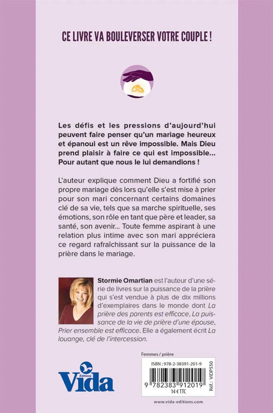 L’auteur explique comment Dieu a fortifi é son propre mariage dès lors qu’elle s’est mise à prier pour son mari concernant certains domaines clé de sa vie, tels que sa marche spirituelle, ses émotions, son rôle en tant que père et leader, sa santé, son avenir... Toute femme aspirant à une relation plus intime avec son mari appréciera ce regard rafraîchissant sur la puissance de la prière dans le mariage.