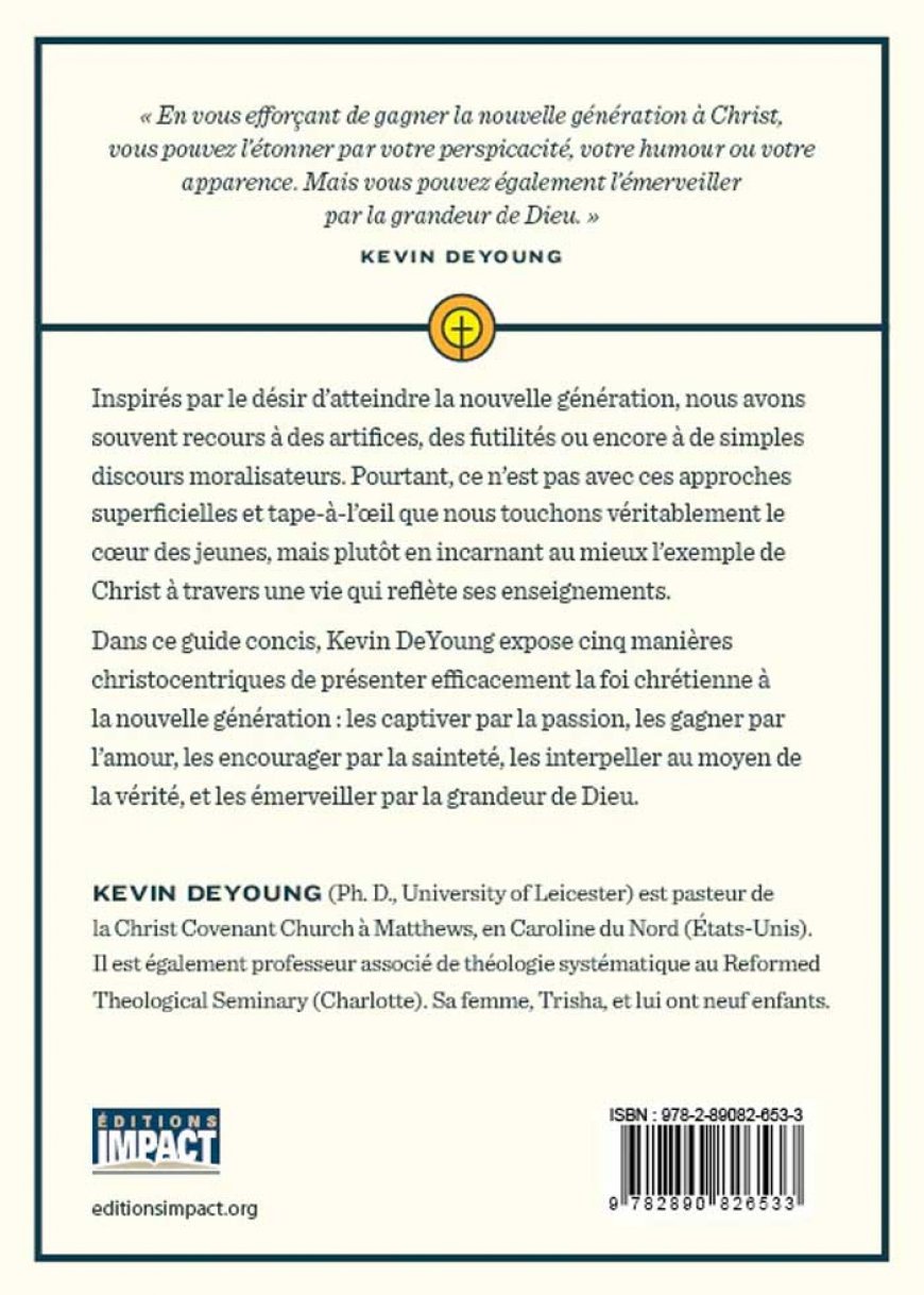 Dans ce guide concis, Kevin DeYoung expose cinq manières christocentriques de présenter efficacement la foi chrétienne à la nouvelle génération : les captiver par la passion, les gagner par l’amour, les encourager par la sainteté, les interpeller au moyen de la vérité, et les émerveiller par la grandeur de Dieu.