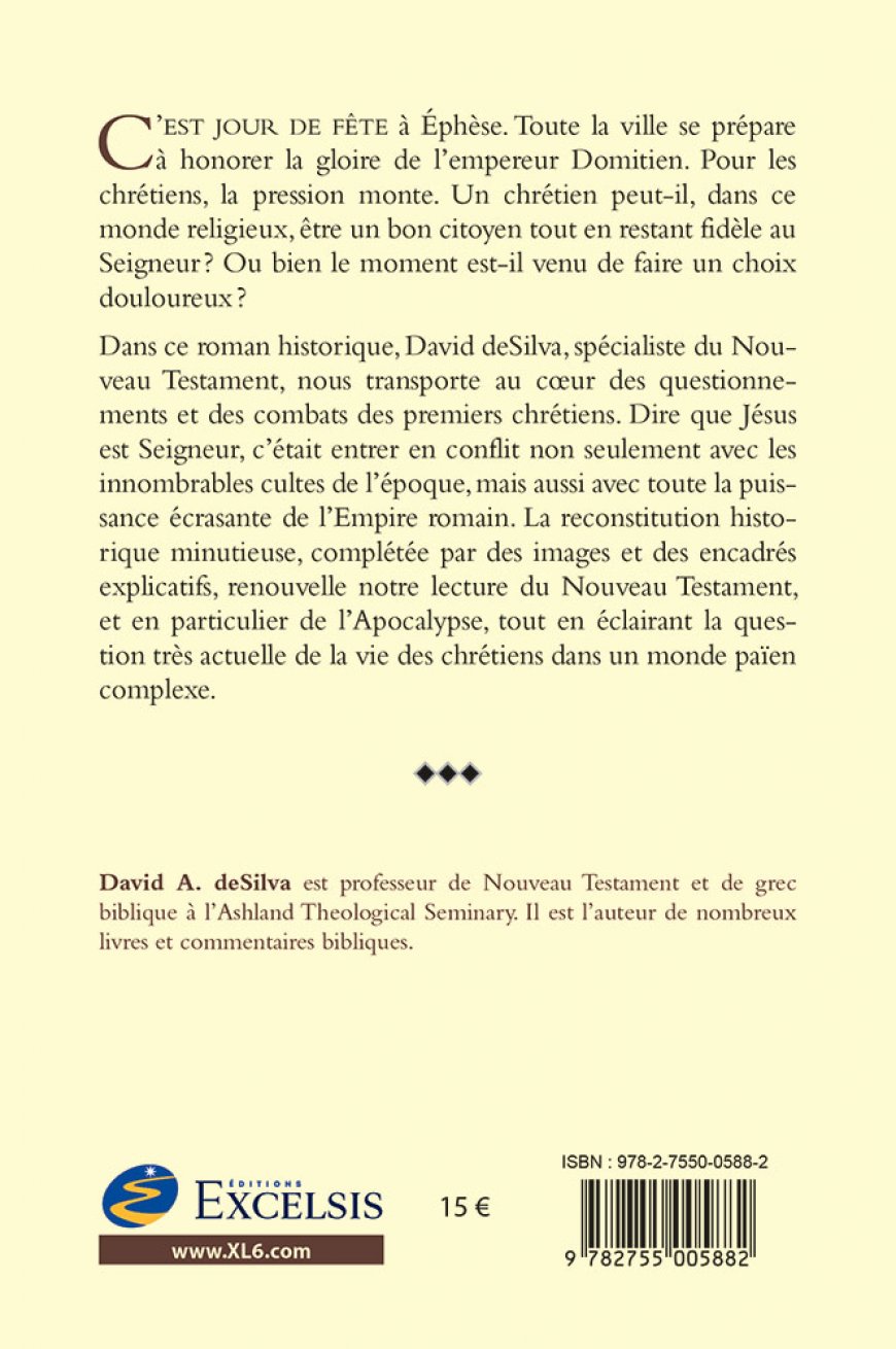 Dans ce roman historique, David deSilva, spécialiste du Nouveau Testament, nous transporte au coeur des questionnements et des combats des premiers chrétiens. Dire que Jésus est Seigneur, c’était entrer en conflit non seulement avec les innombrables cultes de l’époque, mais aussi avec toute la puissance écrasante de l’Empire. La reconstitution historique minutieuse, complétée par des images et des encadrés explicatifs, renouvelle notre lecture du Nouveau Testament, et en particulier de l’Apocalypse, tout en éclairant la question très actuelle de la vie des chrétiens dans un monde païen complexe.